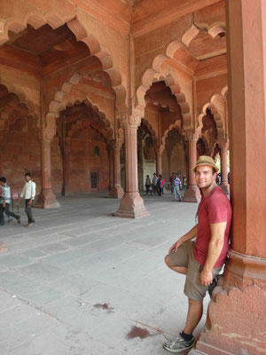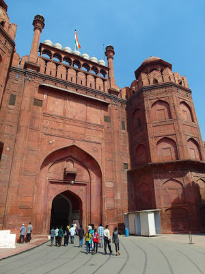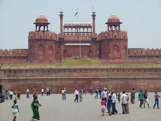 Wir kehrten lediglich für eine Nacht, genauer genommen für einen Tag, zurück in die Hauptstadt. Mitten in der Nacht aus Agra ankommend nahmen wir mehr oder weniger das erstbeste Hotel und holten den nötigen Schlaf zu mindestens teilweise nach. Am letzten Tag in Delhi ging es zum Pardon des gestrigen Agra Forts, dem noch flächenmäßig größerem „Red Fort“. Die Befestigungsanlage des verfeindeten Moguls in Delhi ist aber im Vergleich zum Agra Fort nicht ansatzweise so gut erhalten und beeindruckend. Lediglich ein rekonstruiertes Eingangstor und ein Sandsteingerippe deuteten auf die einstige Pracht hin. Wir wollten jedoch nicht auf einen Rundgang verzichten und versuchten uns somit in die längst vergangene Herrlichkeit der Mogulstadt hineinzuversetzen.