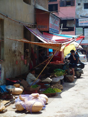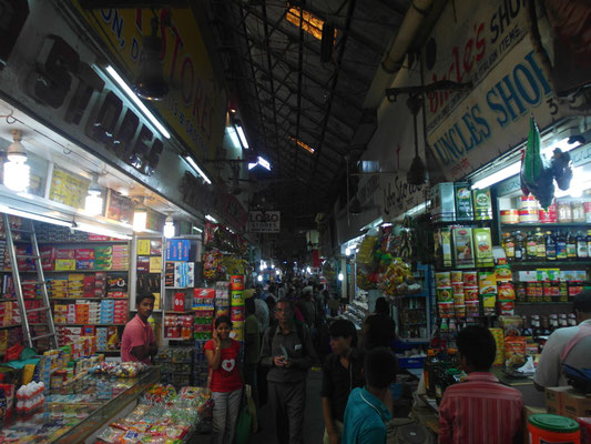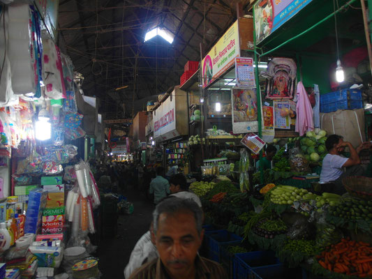 Nach dem Ausblick fuhren wir mit dem altbekannten Taxi durchs städtische Chaos zum Crawfort-Market, dem größten Basar der Stadt, abseits der Touristenattraktionen. Der Basar war groß genug, um eine eigene Stadt darstellen zu können. Touristen schienen sich an diesen Ort für gewöhnlich nicht zu verirren und so waren auch die meisten Verkaufsschilder in Hindu-Schrift. Dicht an dicht reihten sich die Stände, lediglich durch schmale stickige und staubige Gänge miteinander verbunden. Ein uriges Gefühl.