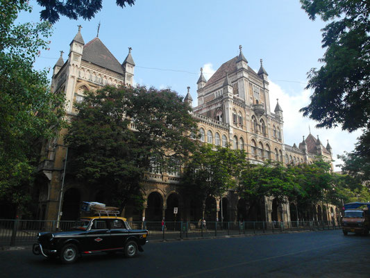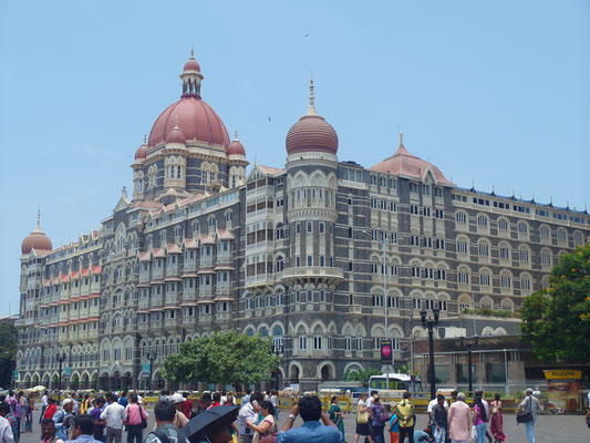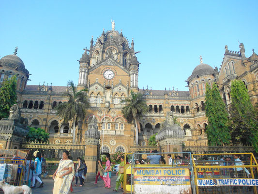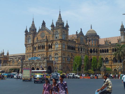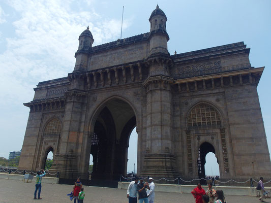 Um ein weiteres Stück schlauer, ging es für uns nach dem Frühstücken auf Sightseeing-Tour. Erste Anlaufstelle war das in unmittelbarer Nähe liegende „Taj Mahal Palace“, ein prächtiges fünf Sterne Hotel, das durch seine märchenhafte Mischung aus den Architekturen des Islams und der Renaissance besticht. Der Prunk des Gebäudes war faszinierend und besonders die Innenausstattung glänzte mit sehr viel Liebe zum Detail. Im Anschluss ging es zum direkt danebenliegenden „Gateway of India“, dessen kühner Basaltbogen mit Blick auf den Hafen Ausdruck kolonialen Triumphs ist. Die beiden Monumente waren das Ergebnis einer ausgeprägten Kolonisation des Subkontinents durch Großbritannien und spiegelten den europäischen Einfluss in Mumbai sehr ausdruckvoll wider. Wir ließen die Blicke schweifen und sogen die Atmosphäre auf wie ein Schwamm. Nach kurzer Erholungspause unter einer schattenspendenden Palme ergötzten wir uns in tropischer Hitze noch zahlreiche weitere architektonische Meisterwerken aus der Kolonialzeit, wie der „University of Mumbai“, der Victoria Station, dem Hauptbahnhof der Stadt und dem „National Post Centrum“. Bei der Hauptpostzentrale nutzten wir zudem die Chance ein Paket mit überflüssigen Utensilien ins ferne Zuhause zu verschicken. Wie sich innerhalb der ersten zweieinhalb Wochen herausstellte, waren u.a. Kochgeschirr und Gaskocher völlig unnötig.