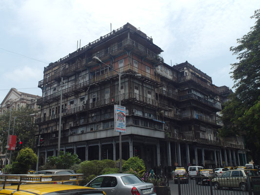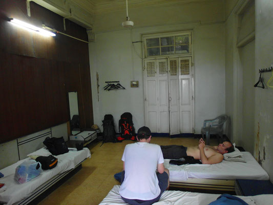 Im gediegenen Stadtteil, gelegen auf einer südlichen Landzunge und Ursprung der Stadtentwicklung zu britischen Kolonialzeiten, namens Colaba, angekommen, wurde eine nette kostengünstige Unterkunft in direkter Hafennähe aufgesucht. Unser Appartement war das geräumigste bis dato, besaß kolonialzeitgetreue vier Meter hohe Decken mit Stuck, aber nicht minder wenig Schimmel und eigenartig aussehenden Rostflecken an Wänden und Decken. Aber die Lage war top und die paar entdeckten gekräuselten Schamhaare im löchrigen, gelb versifften Bettlaken mussten einfach hingenommen werden. Nein im Ernst, das Hotelzimmer, wenn man es als so eines bezeichnen mag, war wirklich ekelig. Geschlafen wurde auf unseren eigens mitgebrachten Isomatten.