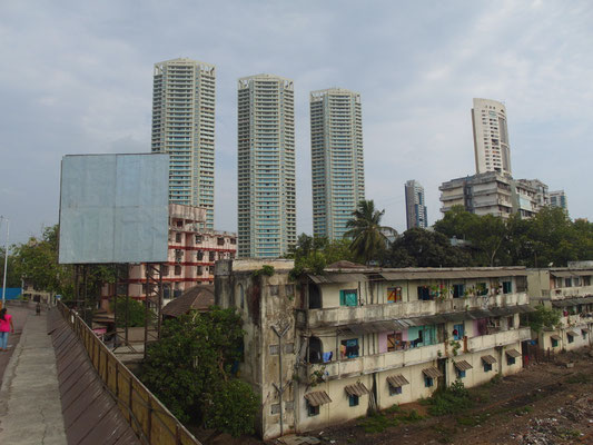 Den Aussagen des Einheimischen zufolge handelte es sich um ein ehemals riesiges Slum, dass vor einigen Jahren den Bulldozern weichen musste. Ohne Rücksicht auf Verluste entstand aus einem ärmlichen Stadtteil ein modernes, wohlhabendes Gebiet, in dem Skyscraper die Stadtlandschaft dominieren. Die Slumbewohner waren gezwungen noch weiter an den Stadtrand im Landesinneren zu ziehen. Ein Verhalten, welches schematisch für die soziale Ungerechtigkeit in Indien infolge des knallhart dominierenden Kapitalismus steht. Soziale Marktwirtschaft in Verflechtung mit einer funktionierenden Demokratie, wie wir es aus Europa und speziell aus Deutschland kennen, sucht man hier vergebens. Mumbai lebt, wie keine Stadt zuvor auf dem Subkontinent das Lebensmotto "Schaffe den Sprung in die obere Gesellschaft oder gehe unter". Allen kritischen Empfindungen zum Trotze, hatte man von dem Hügel einen herrlichen Ausblick über die Megametropole und bekam einen guten Eindruck, wie riesig diese Stadt wirklich ist. Soweit das Auge reichte: Beton und ein von Unrat verdreckter Küstenabschnitt!
