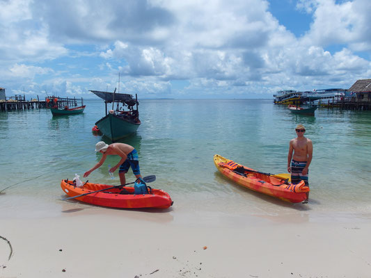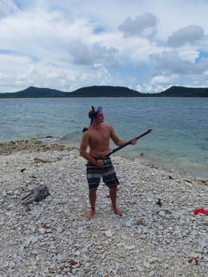 Am nächsten Tag lieh man sich zusammen mit Nico, einem Deutschen mit dem wir uns bereits am ersten Tag auf der Insel anfreundeten, ein Kajak, Schnorchel-Ausrüstung und eine Harpune aus und fuhren zu einer kleinen ungefähr zwei Kilometer entfernt vorgelagerten Insel. Bei strahlendem Sonnenschein stellte sich dies jedoch mit unserer mangelnden Erfahrung als eine ganz schön schweißtreibende Arbeit heraus. An Spaß mangelte es jedoch nicht. Auf der kleinen Insel angekommen, empfing uns ein komplett weißer Korallenstrand von unfassbarer Schönheit, der definitiv seinen Gleichen suchte. Kurz ausgeruht und die schätzungsweise 1000 Quadratmeter kleine Insel erkundet, wartete das Abenteuer mit Harpune auf uns. Aber bevor es losging, musste erst noch das Rätsel des Ladens der Harpune gelöst werden. Wie in Südostasien üblich bekommt man solch ein Mordwerkzeug einfach in die Hand gedrückt und fertig - vorausgesetzt, dass das Geld den Besitzer wechselt. Gedanken wie "Hoffentlich schieß ich mir damit nicht selber in den Fuß" kamen in mir hoch. Aber nach einigen Ingenieursgefummel war die Harpune geladen und man begab sich auf die Jagd...