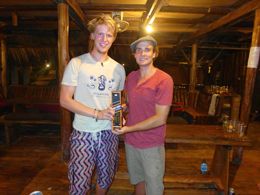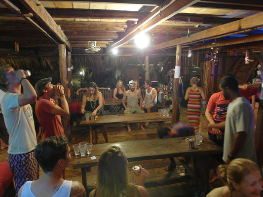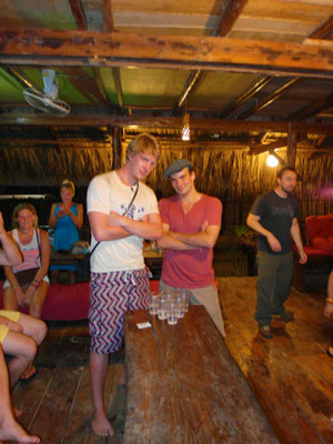 An den Freitagen und Samstagen herrschte in unserer Bar jeweils ein Motto und das heutige sollte Beerpong heißen. Beerpong kennt ja jeder oder? Ein klasse Trinkspiel, bei dem die gegnerischen Zweier-Teams mit einem orangenen Tischtennisball jeweils auf eine Dreiecksformation von 10 Bechern auf der jeweils gegenüberliegenden Seite des Spielfeldes werfen. Jeder Becher, der von der gegnerischen Mannschaft getroffen wurde, muss ausgetrunken werden. Die Mannschaft, die zuerst alle Becher des Gegners treffen konnte, ist der Sieger. Insgesamt formten sich 13 Teams, die sich alle einen besonderen Teamnamen überlegten. Björn und ich waren die fremdernannten „Ladyboys“ und traten in der ersten Runde gleich gegen Dan und Rob aus unserer Reisegruppe an - blödes Lospech! Aber wir haben nicht lange gezappelt und unseren Gegner einfach wie die Panzer überfahren. In der zweiten Runde folgte abermals das Lospech - unsere Gegner hießen Djoeke und Nico. Leider mussten auch sie sich uns geschlagen geben, auch wenn es ein deutlich knapperer Sieg war als der davor. Im anschließenden Halbfinale durfte man dann gegen ein Pärchen antreten, die ihre Spiele zuvor mit Bravour gewannen, und gleich loslegten wie die Feuerwehr. Drei ihrer ersten vier Würfe waren Treffer. Aber wir wären nicht die "Crazy Germans" oder wie an dem Abend "die Ladyboys", wenn wir nicht zurückkommen würden. Es folgte mit zwei Doppeltreffern einer unserer Glanzstunden und der Rückstand war aufgeholt. Am Ende gewann man dann doch relativ deutlich mit 10:6. Nun war das Finale angebrochen und unsere Gegner waren zwei Engländer. Wie klassisch - Deutschland vs. England! Und das Spiel war echt eine enge Kiste. Nachdem mittlerweile alle vier schon reichlichen Bier konsumiert hatten, fanden die Bälle nicht mehr so klar den gegnerischen Becher, wie in den Spielen zuvor. Nach spannenden 15 Minuten stand es schließlich 9:9 - ein Treffer und das Spiel wäre entschieden! Nervosität kam auf, man kann doch nicht den Engländern unterliegen. Bei jedem Wurf hochkonzentriert und doch sprang der Pingpongball immer wieder nur auf den Rand des Bechers. Was für eine Spannung. Eine riesige Besuchertraube um den Spieltisch herum war dann schlussendlich Zeuge wie ich den finalen Treffer landete und wir, die Ladyboys, das Turnier gewannen. "We are the Champions, we are the Champions"! Als Trophäe erhielten wir eine große Flasche Rum, die wir nachdem man eine Runde mit unseren Unterlegenen im Finale trank, mit dem Rest unsere Gruppe teilten. Der Abend war wirklich, wie Barni Stinson sagen würde "legen.......dary"!
