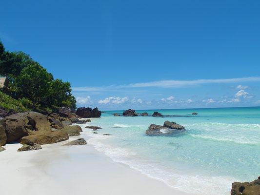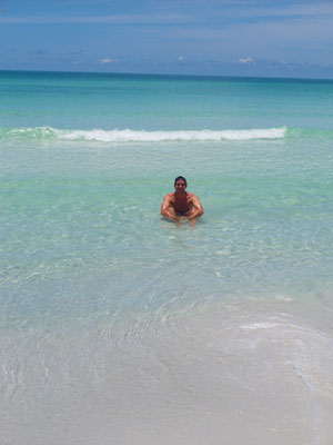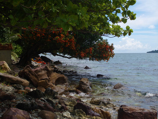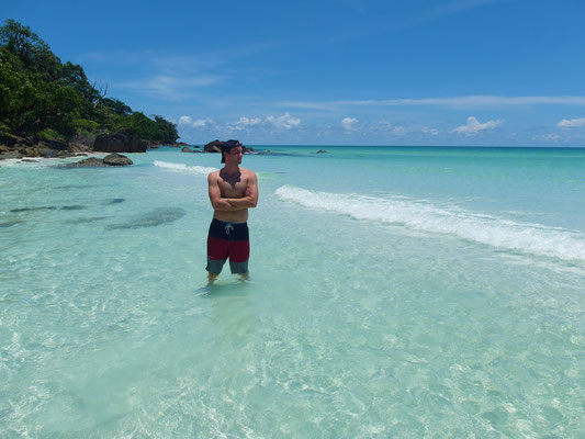 Am nächsten Tag hieß es dann wieder Abschiednehmen, man fuhr mit der Fähre um 16 Uhr zurück zum Festland. Allerdings war bis dahin ja noch genügend Zeit und man nutzte sie gleich nach dem Auschecken um 9 Uhr morgens damit, einmal über die Insel durch den Dschungel zu wandern und sich an einen anderen, uns empfohlenen, einsamen Strand zu legen. Der Weg dorthin, auch als Flipflopweg bezeichnet, wurde seinem Namen gerecht - man folgte quer durch den Dschungel über Felsen und unter Lianen hindurch, an Bäume genagelten Flipflops. Da es sich um eine knappe Stunde Wanderung handeln sollte und der Weg als schweißtreibend bezeichnet wurde, ließ sich leider keiner außer Nico finden, der mich begleitete. Björn musste auch passen, da er unnatürliche Ohrenschmerzen zu beklagen hatte. Zu zweit machte man sich auf den Weg, ein typischer Dschungel, der einen schon ordentlich ins Schwitzen brachte, aber sich definitiv lohnte. Was einem dort ins Auge stach, lässt sich kaum in Worte fassen. Ich habe schon viele Strände in meinem Leben gesehen, aber welch‘ natürliche Schönheit sich uns erstreckte, ließ einen nicht mehr aus dem Staunen kommen. Gefesselt von der anmutenden Schönheit des Strandes, blieb man einfach auf den feinsten, von mir jemals gefühlten, Sand stehen und genoss den Anblick ohne auch nur ein Wort zu verlieren. Traumhaft. Nach ein paar Fotos im und am nun endlich kristallklaren türkisen Wasser, legte man sich schön entspannt in den Sand und ließ sich von der leichten Brise einpanieren. So kann man es aushalten.