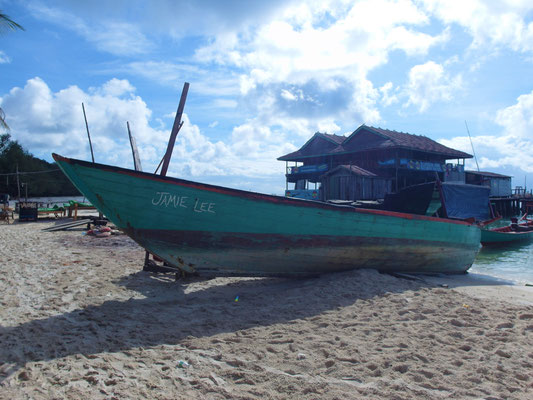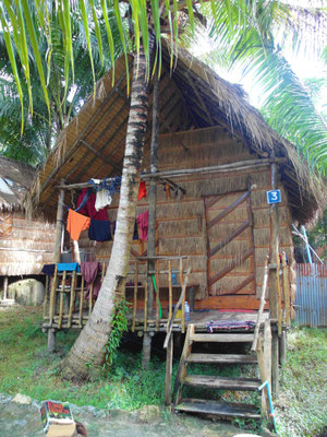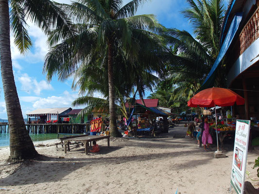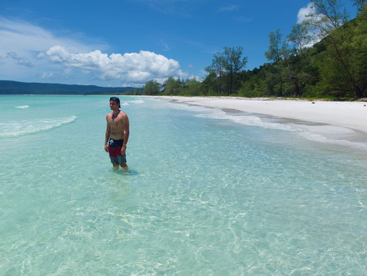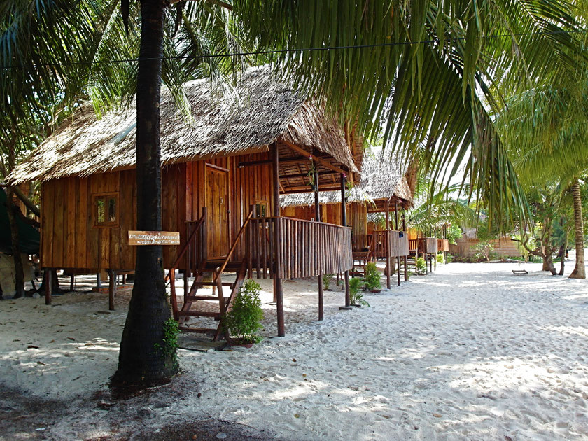 Nun waren wir aber endlich am Ziel. Endlich wieder Strand und Koh Rong hatte es echt in sich. Ein kleines einheimisches Mini-Dörfchen am Strand mit nackt herumlaufenden Kindern - sehr authentisch - und fünf kleinen Guesthouse mit vielleicht jeweils 10-15 Bambus- bzw. Holzhütten. Absolut idyllisch, ganz anders als auf den thailändischen Inseln. Auf einem kleinen wackeligen Holzsteg angekommen, ging es für uns direkt ins Cocos-Guesthouse. Wie bei den anderen Guesthouse bestanden die Hütten alle aus Holz und Bambus, hatten Stromanschluss aber keinen Ventilator - Strom wird nachts ohnehin abgestellt - und versprühten eine herrlich entspannte Atmosphäre. Ein von Palmen gesäumter puderweißer und menschenleerer langgezogener Strand erinnerte stark an die Perhentians, versprühte aber noch ein wenig mehr die Ruhe und Gelassenheit, nach der ich so lechzte. Auch wenn es nun meckern auf hohem Niveau ist, war der einziger Minuspunkt das nicht kristallklare Wasser. Wir mussten uns mit Sichtweite von "nur" 10 Metern zufriedengeben, welches aber bei solch paradiesischer Atmosphäre einem fast gar nicht störte.