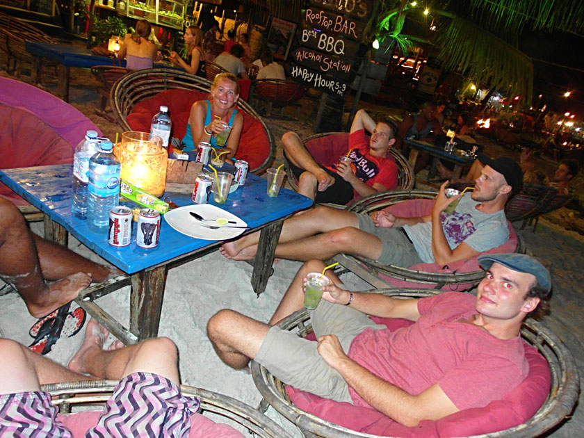 Da sich zu Abend die ganze Insel, bestehend aus maximal 50 Backpackern, in einer der beiden BBQ-Restaurants traf, verbrachte man die Abende stets in geselliger Runde. Ausgerüstet mit Cocktails und Zigarren saß man äußerst bequem in einer der vielen Sitzmuscheln und hatte bei den unzähligen Gesprächen jeglicher Art viel zu lachen. Besonders unser kleiner Spaßvogel Dan bereitete uns viel Spaß.