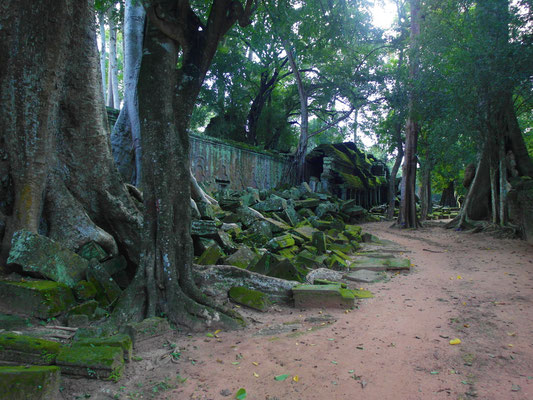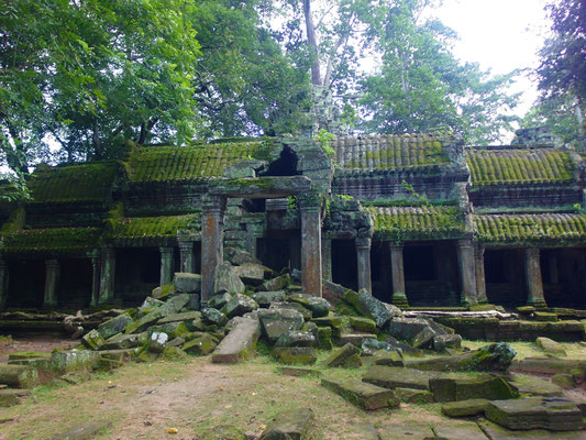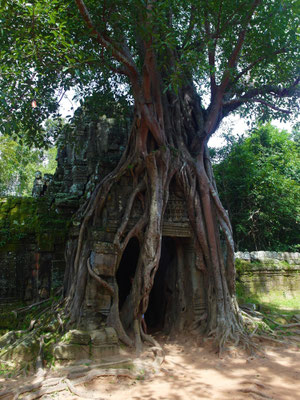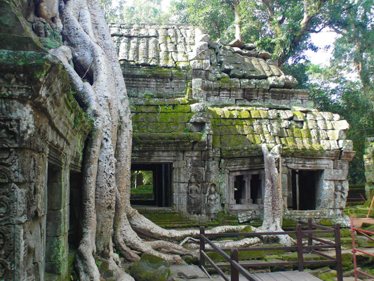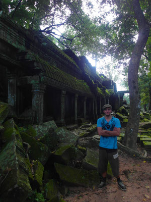 Das eindrucksvollste am ganzen Tag waren für mich die mehr oder weniger schon größtenteils verfallenen Tempel. Manche davon waren komplett Moosbewachsen, auf anderen wuchsen teilweise riesige Bäume, die sich im Laufe der Jahrhunderte zurückgeholt haben, was einst ihnen gehörte. Sie drücken einerseits Steine auseinander und führen so zur partiellen Zerstörung der Anlagen, halten aber andererseits mit ihrem Wurzelwerk auch die Steine wieder zusammen und konservieren so ein Stück weit die großen Tempelanlagen. Trotz der Bewunderung über die Symbiose aus antiker Baukunst und Natur waren es leider Gottes nur Tempel, denen gegenüber ich nicht sonderlich viel Interesse mehr aufbringen konnte. Zu sehr hatte man sich bereits an Tempel sattgesehen. Außerdem fieberte ich vielmehr unserer Heimkehr entgegen, weshalb ich auch an dieser Stelle nicht mehr viele Worte über Angkor Wat verlieren will. Nur so viel noch: Angkor Wat ist definitiv ein Abstecher wert und...
