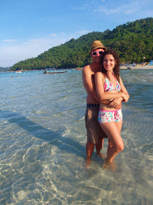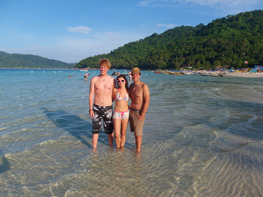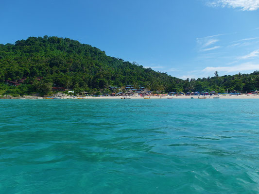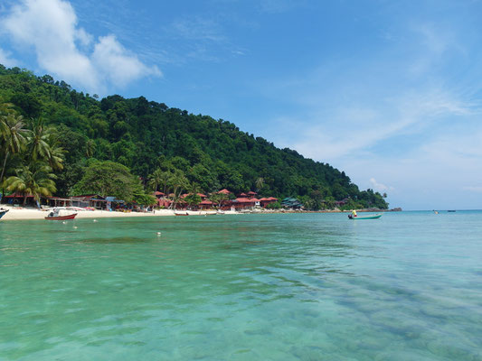 Nach ein paar Zwischenstopps auf der größeren Nachbarinsel „Pulau Perhentian Besar“, auf der bereits die ersten Hotels Einzug hielten, erreichten wir den Long Beach auf „Pulau Perhentian Kecil“. Trotz bereits untergehender Sonne, erstrahlte die Insel in einem satten Grün mit weißem Sand und das Meer glitzerte wie ein azurblauer Diamant. Der Anblick ließ die gesamte Besatzung paralysieren. Ein Traum wurde wahr und die Eindrücke aus Pulau Tioman wurden nochmals übertroffen. Ein unbeschreibliches Panorama. In ungefähr 200m Entfernung zum Ufer wechselten wir im seichten kristallklaren Wasser vom Speedboot in mehrere kleine Paddelboote mit minimalster Motorisierung und wurden so bis auf wenige Meter an den Strand gebracht. Noch die letzten Meter durchs warme Wasser gewatet und dann konnte man endlich einen Fuß auf die Insel unserer Träume setzen. Ein fast unberührtes Paradies, das nicht von dieser Welt zu sein schien. Mit dem Dschungel und einem Palmengürtel direkt am Übergang zum Strand zu unserer Linken und dem unbeschreiblich azurblau strahlenden Meer zur Rechten, begaben wir uns auf Unterkunftssuche.....