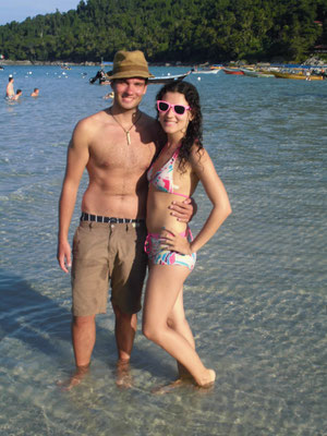 Der nächste Morgen begann für mich sehr früh. Während Björn noch in den tiefsten Träumen schwebte, begab ich mich um sieben Uhr zum Strand und wartete auf die Ankunft von Nicolle. Gespannt wurde aus der Ferne beobachtet, wer in welches Paddelboot umstieg, um ja an der richtigen Stelle zu warten. Ich hatte ihr via Facebook versprochen, dass ich ihr bei den letzten Metern durchs Wasser mit ihrem Koffer helfen würde. Mein Puls erhöhte sich und ich wurde leicht nervös. "Was soll ich zu ihr sagen? Wie soll ich sie begrüßen?" Als sie dann aber mit dem Boot in Ufernähe anlegte, verflog die Nervosität und wir begrüßten uns ganz herzlich. Gemeinsam traten wir den Weg zu unserer Hütte an, dass sich angesichts ihres knapp 25kg schweren großen Koffers für mich als Frühsport herausstellte. Björn war zwar bereits aufgewacht, wollte aber noch nicht wirklich aufstehen und so machten wir beide uns, nachdem wir eine zusätzliche Matratze für unsere Hütte organisiert hatten, auf den Weg zurück zum Strand. In einem Restaurant aßen wir zu Frühstück und hatten uns eine Unmenge zu erzählen. Ihre Haare erstrahlten in der Sonne so wunderschön haselnussbraun und auch ihr Lächeln ließ es mir schwerfallen, ihr zu zuhören. Immer wieder schoss mir ein "WOW, wie hübsch und niedlich zugleich" durch den Kopf. Wir amüsierten uns prächtig und nachdem Björn ein paar Stunden später dazu stieß, legten wir uns faul an den Strand. Während es Björn trotz zahlreicher Wolken am Himmel zu heiß wurde und nach nur einer halben Stunde mit Schnorchel Ausrüstung die Flucht ins Wasser suchte, blieben Nicolle und ich am Strand zurück. Es herrschte eine ausgelassene Stimmung zwischen uns. Mit einem äußerst wohligen Gefühl verging die Zeit bis Björns Rückkehr wie im Flug. Björn seinen Erzählungen zu Folge war das Schnorcheln ein kleines Highlight. Neben zahlreichen Fischen jeglicher Art, Blaupunktrochen und interessante Fels- und Korallenformationen wurde er Zeuge einer Ansammlung von Schwarzflossen-Riffhaien, von denen er bis zu acht Stück gleichzeitig beobachten konnte. Im seichten Wasser sollen sie ihre Kreise gezogen und kleinere Fische gejagten haben. Die Haie sollen allerdings fast alle nur etwa armlang gewesen sein - also Babyhaie. Jedoch störte er scheinbar auch zwei weitere ausgewachsene Exemplare beim Gammeln zwischen den Felsen, weshalb die schätzungsweise etwa anderthalb Meter langen Geschöpfe plötzlich und pfeilschnell an ihm vorbei in Richtung Freiwasser schossen. Es wäre zweifellos ein ganz besonderes Erlebnis gewesen, diesen majestätischen aber für Menschen meistens ungefährlichen Tieren so nah zu sein und zwischen ihnen zu schnorcheln, doch hatte ich in diesem Moment andere Sachen im Kopf. Und die drehten sich zweifellos alle um nur eine Person "Nicolle".