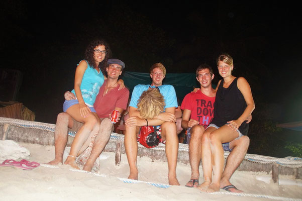 Am Vorabend hatten Björn und ich uns bereits mit Hanna und Freddy für um drei Uhr am Coral Beach im Osten verabredet und so begaben wir uns zu dritt nach Björns Haierfahrungen auf den Weg zur anderen Inselseite. Nach einem gemeinsamen verspäteten Mittagessen und unzähligen Gesprächen wanderten wir zu fünft zu einer verlassenen Bucht unweit des Coral Beaches, vorbei an zahlreichen Bananenpalmen und dichter Vegetation. Am Ziel, eine ca. 30m lange Bucht mit feinstem Sandstrand befand sich abgesehen von uns keine Menschenseele - noch nicht einmal Fußabdrücke waren im Sand zu erahnen. Während Freddy seine mitgebrachte Slackline zwischen zwei Palmen im Sand aufspannte und Hanna und Björn beim Schnorcheln einige Barrakudaschwärme beobachteten, machten Nicolle und ich es uns am Strand gemütlich. Dabei berührten uns recht zufällig das erste Mal unsere Hände im Sand und ....