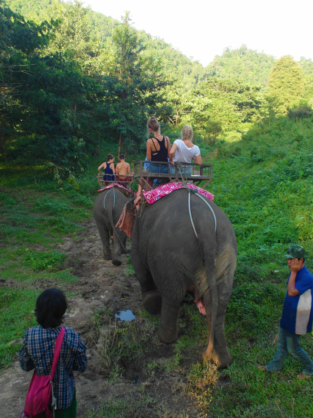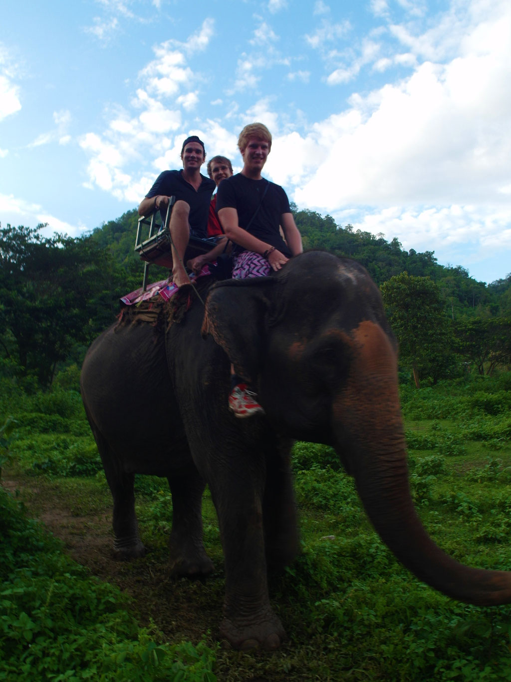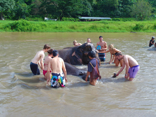 Nachdem man das chaotische und pulsierende Leben von Bangkok hinter sich ließ, ging es mit einem Nachtbus über elf Stunden lang nach Chang Mai in den Norden Thailands. In Bangkok selbst und auf der Busfahrt hatte man eine ganze Reihe von Reisenden, die noch grün hinter den Ohren zu sein schienen, getroffen. Beim Unterhalten klärte man sie mit unserer mittlerweile gesammelten Erfahrung darüber auf, auf was man beim Backpacken zu achten hat, auf was man komplett verzichten und welche Fallen leider Gottes in dieser doch für Europäer sehr fremden Welt existieren. Besonders Bangkok ist keine Stadt für Anfänger, sei denn einem ist sein Geld egal und man gibt gerne ein Vielfaches als normal bzw. nötig aus. Indien hat uns diesbezüglich schon sehr geprägt und uns fast zu teilweise respektlos und unverschämt wirkenden Profis geformt, besonders was das Handeln in Taxen und Tucktucks betraf. Nach unterhaltsamen knapp 12 Stunden Busfahrt in einem unmenschlich herunter gekühlten Gefährt und einigen Lehrstunden kamen wir morgens früh mehr oder weniger ausgeschlafen bzw. erfroren in Chang Mai an. Chang Mai ist nach Bangkok DIE Touristenstadt in Thailand, trotz nur knapp 200.000 Einwohnern. Da die Natur soll hier so sehenswert sein soll und als thailändischer Dschungel umworben wird, trudeln in Chang Mai täglich Scharen an Touristenbusse ein. Die meistens von ihnen buchen Ein-Tages-Touren in den Dschungel, gucken sich eine der zahlreichen Tiershows an oder reiten auf Elefanten in einen der unzähligen Elefantencamps. Da ich immer noch nicht ganz fit war, entschieden wir uns diesmal im Gegensatz zu Nepal und Malaysia nicht auf eigene Faust durchs Unterholz zu laufen, sondern eine geführte Tour über drei Tage zu buchen. Auch mal eine andere Erfahrung, die nicht ausgelassen werden durfte. Ohnehin wäre das nur wieder eskaliert, wenn wir alleine los gestiefelt wären. Auf dem Plan der Dreitagestour standen verschiedene Sachen, wie zum Beispiel Trekken, Wasserfall-Schwimmen, Rafting, sowie das Reiten und Waschen von Elefanten; Von allem ein bisschen sozusagen....