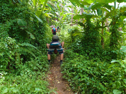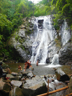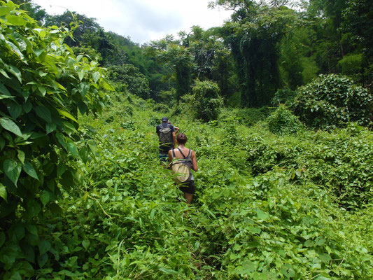 Anschließend duschte man sich mit klarem Wasser im Camp ab und packte seine Sachen zusammen. Unsere Gruppe teilte sich auf, während ein Großteil lediglich eine Zweitagestour gebucht hatte, ging es für uns und sechs anderen separat mit einem Jeep weiter. Keine Ahnung warum man die zwei Kilometer unbedingt mit einem Geländewagen zurücklegen musste, aber wir stellten die Organisation nicht weiter in Frage. Vom neuen Trekkingausgangspunkt aus ging es ca. eine halbe Stunde durch einen merklich dichter werdenden Wald, bei dem das Unterholz durch die wenigen Sonnenstrahlen glänzend angestrahlt wurde, zu einem Wasserfall. Der schätzungsweise sieben Meter hohe Wasserfall war rein optisch nichts Besonderes, aber man konnte im hineinfließenden kleinen See baden und sogar die Felsen am Wasserfall hinunterrutschen. In Manier eines wahren Abenteurers konnte man sich an dem Experiment des sogenannten Canyoning versuchen – eine Light-Version davon zu mindestens. Natürlich war es nicht ganz ungefährlich, denn man musste aufpassen sich nicht am Felsen zu verletzten, aber die "Crazy Germans" haben natürlich den Anfang gemacht. Erst rutschte man eine glitschige Felsspalte im 60° Winkel hinunter ehe man nach einer kleinen Kurve im freien Fall in eine braune Suppe fiel. Einfach nur genial....