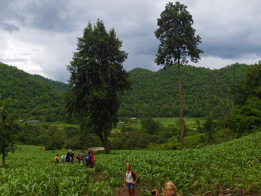 Die unendlich scheinende Touristenparade von ungefähr 30 jungen Menschen bahnte sich im Gänsemarsch einen Weg durch den Dschungel. Ich würde es allerdings mehr als thailändischen Wald bezeichnen, denn seit Malaysia weiß ich wie wirklich ein Dschungel aussieht und wenn man beim Blick nach oben den Himmel besser sehen kann als in einem deutschen dichteren Wald, dann ist der Begriff Dschungel doch schon etwas falsch gewählt. Dennoch war die Natur echt schön - überall riesige Bambussträucher und prächtige Weiden, lediglich unterbrochen von Bananensträuchern und ein paar Mohnpflanzen. Das Klima war wie zu erwarten heiß und feucht. Da sich die Anstrengung aber deutlich in Grenzen hielt, lagen die klimatischen Bedingungen aber noch absolut im menschlichen Rahmen. Nachdem man im Schneckentempo einen doch schon sehr deutlich zuerkennenden breitgetretenen kleinen Pfad entlangging, musste man erschreckenderweise feststellen, dass die Hälfte der Touristen am Keuchen war, wie die Säue, und nach nur drei Stunden Wanderung zum Teil am Ende ihrer Kräfte ankamen und dass obwohl unterwegs reichlich Pausen gemacht wurden. Auf Fragen warum wir nach den drei Stunden noch so fit aussahen, uns bei Pausen nie setzten und in der Lage waren trotz "Anstrengung" sich dauerhaft zu unterhalten und sogar zu witzeln anfingen, kam immer die gleiche Antwort: Nepal und Taman Negara. Die damalige Intensität an Abenteuer war nicht im Entferntesten mit dem hier zu vergleichen. Es war uns sogar manchmal sichtlich peinlich über die vorherigen Trekkingtouren zu erzählen, weil es irgendwie für die Anderen Lichtjahre entfernt zu seinen schien. Ab diesem Zeitpunkt hießen wir nur noch die "Crazy Germans"!