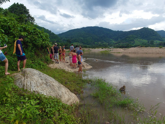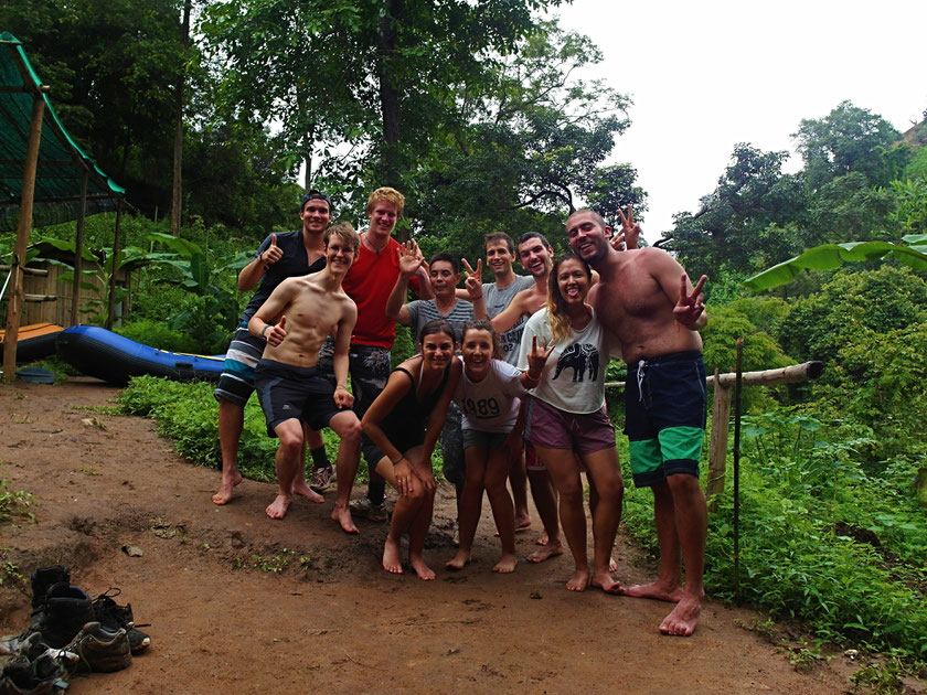 Der nächste Morgen begann für mich leicht verkatert und extrem schläfrig. Ich bahnte mir mit zugekniffenen Augen barfuß einen Weg zum in der Nähe liegenden Fluss und versuchte durch das kalte Wasser aus den Bergen Nordthailands wach und klar im Kopf zu werden. Und es half. Nach dem sehr frühen Frühstück um sieben Uhr waren Kopfschmerz und Müdigkeit weitestgehend verflogen und die Trekkingtour konnte weitergehen. Wir folgten für ungefähr zwei Stunden im Gänsemarsch einen kleinen Pfad am Berghang steil bergab. Noch deutlich vor dem höchsten Sonnenstand erreichten wir einen weiteren Wasserfall, bei dem man sich zwar nicht am Canyoning versuchen durfte, der aber trotzdem zum Schwimmen einlud. Leider hatte das Wetter gewechselt und der Regen prasselte unaufhörlich auf uns nieder. Die "Crazy Germans" gingen natürlich trotzdem Baden, auch wenn sich alle anderen in einer Höhle versteckten. Nachdem alle auf uns beiden einzigen Badegäste warteten, ging es weiter auf extrem glitschigen Untergrund bergab. Dass ich dabei auf mein Schuhwerk verzichtete und fortan barfuß über Stock, Stein und rutschigem Lehmboden ging, stieß ähnlich der Erzählungen aus dem Taman Negara auf Verwirrung und „Kopfschütteln“. Ich bestätigte ein weiteres Mal den bereits uns umgebenen Ruf vom „verrückt sein“. Nach einer weiteren ungefähr einstündigen Wanderung erreichten wir einen reißenden Fluss, an dessen Ufer eine schmale Lehmstraße endete. Dort warteten bereits einige Jeeps und ein paar kleine Raftingboote auf uns....