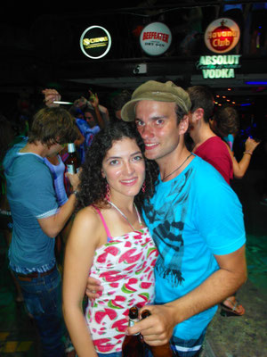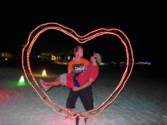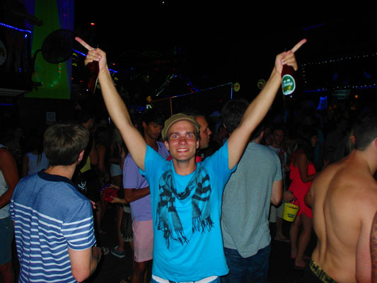Am Abend war schließlich die Zeit für die Réunion des Wolfspacks gekommen. Henning hatte in Bangkok vier Tage Langeweile - er wartete auf Besuch aus Deutschland - und entschied sich kurzerhand dazu uns zu besuchen. Toll! Björn war zwar immer noch so sehr neben der Spur, dass man ihn am Abend nach dem Essen leider im Bett zurücklassen musste - er wird halt alt! Doch Henning und ich ließen es uns nicht nehmen in einer quirligen Cocktailbar aller Hand Neuigkeiten auszutauschen. Es war schön ihn mal wiederzusehen und wir hatten uns sehr viel zu erzählen. Um 11 Uhr suchte allerdings auch er den Weg ins Bett, denn schon am nächsten Tag sollte es für uns gemeinsam mit Björn in den "Ang-Thong-Meeresnationalpark" zum Tauchen gehen. Für mich bedeutete dies jedoch noch lange nicht Ende, man musste sich schließlich treu bleiben. Mit Nicolle ging es erst in eine Strandbar mit unheimlich beeindruckender Feuershow und anschließend in einen Club, der sich jedoch gefühlsmäßig mehr als Ort zum "Anfreunden" mit einheimischen Frauen, entpuppte. Wir entschieden uns wieder zurück zum Strand zu gehen und langsam Richtung unserer Hotels zu schlendern - schließlich musste ich ja auch am nächsten morgen früh aufstehen. Unser Strandspaziergang entwickelte sich als äußerst romantisch. Als es anfing zu regnen, liefen wir im Regen über den Strand. Es war ein ganz besonderer Moment, den ich nie vergessen werde. Unbekümmert vom Platzregen drehten wir uns am Strand im Kreis, lachten viel, alberten rum und küssten uns. Es war ein magischer Moment. Ein Moment für die Ewigkeit.