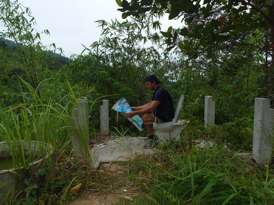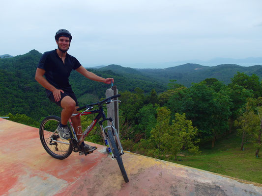 Pünktlich um 8 Uhr klingelte der Wecker und wir kamen auch tatsächlich um 9 Uhr los! Björn, so schien es anfangs, war relativ fit und meine Magenkrämpfe hatten sich in der Nacht auch stückweise gelegt. Während man anfangs einen 15km langen aussichtsreichen Küstenstreifen noch relativ entspannt entlangfuhr und dabei andere Urlaubsorte als den Chaweng Beach sah, begann anschließend die Bergetappe. 500 Höhenmeter hieß es bei der Inselüberquerung zu bewältigen und das bei einer für mich unmenschlichen Steigung. Zu dem kam noch das sportunfreundliche Wetter - zwar war es schon mal deutlicher wärmer und feuchter, aber leicht bewölkte 30 Grad haben schon ausgereicht, meinen Körper so richtig aufzuheizen. Ich bin ja sowieso nicht der ganz große Profi im Radfahren - Wandern und Bergsteigen liegt mir da schon deutlich mehr - und so kam ich bergauf auch ganz schön ins Pumpen. Björn allerdings musste vor dem Vorabend-Alkohol kapitulieren, bevor er noch den Gipfel erreicht hatte....