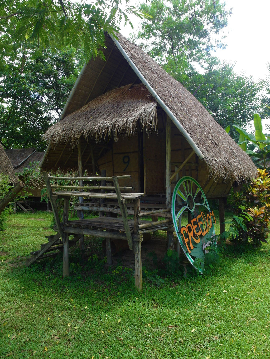 Bereits im Bus ins Bergidyll hatten wir uns mit einem Amerikaner, namens Daniel (kurz Dan), angefreundet und suchten uns zusammen eine Unterkunft. Nach kurzen Empfehlungen von anderen Reisenden auf der schmalen Straße stand unser Entschluss fest: das Giant Guesthouse musste gefunden werden. Es ist eine günstige Unterkunft am Dorfrand bestehend aus im weitläufigen Gelände verteilten kleinen Bambushütten mit Stromanschluss. Jeglicher andere Luxus wie Bett oder winddichte Wände suchte man jedoch vergebens. Auch ein komplett regendichtes Dach war uns an dieser Stelle nicht vergönnt..