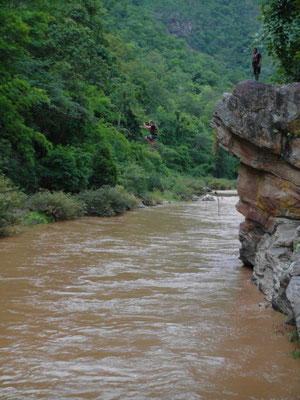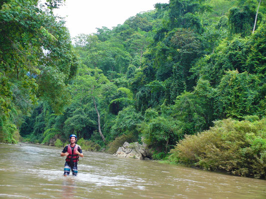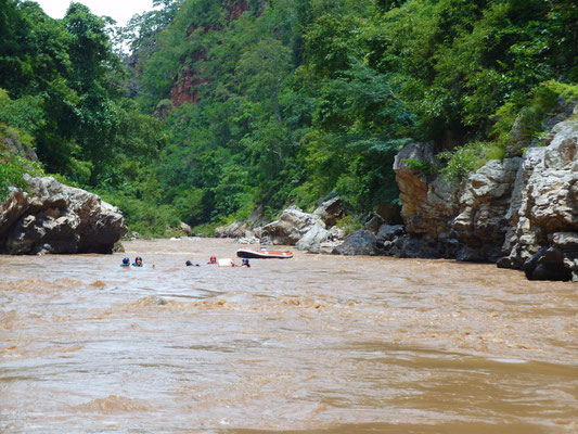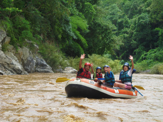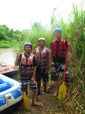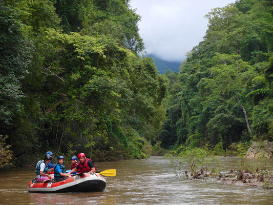 Am dritten Tag war der Drang nach Pause dann schon wieder verflogen. Leider, denn noch ein paar Tage mehr Ruhe hätte mir rückblickend ganz gewiss gutgetan. Doch meine Gier nach Abenteuer schien größer zu sein, als mein inneres Verlangen nach Ruhe und Pause. Warum bin ich nur ein Mensch, der nichts ungemacht sein lassen kann? Ich musste alles ausprobieren, alles erleben, einfach alles mitmachen! Nichts durfte auf meiner Reise des Lebens fehlen. Ich war süchtig und missachte sämtliche Zeichen körperlicher Regeneration. Ich brauchte einfach das nächste Abenteuer - wie ein Junkie. Ich verlangte immer wieder nach einer Adrenalin-Dosis. Und so begaben wir uns mit dem Amerikaner im Schlepptau auf eine Zweitagestour WhiteWaterRafting auf dem Pai-River. Ich setzte mich bei der Buchung ganz gewiss für die deutlich actiongeladenere Zweitagestour ein, da ich die Befürchtung hatte, eine einfache Tagestour mit kleineren Stromschnellen könnte mein Verlangen nach Nervenkitzel nicht hinreichend stillen. Für diejenigen die WhiteWaterRafting nicht kennen, empfehle ich einfach mal ein Randomvideo auf Youtube und "Ja" genauso sah es aus! 60 Stromschnellen - von Klasse 1-4 war alles dabei. Die allernötigsten Utensilien, wie sämtliche Wertsachen, Taschenlampe, Mosiktospray, Handtuch und ein paar trockene Klamotten wurden noch kurz sicher im Drybag verstaut, bevor es auch schon zusammen mit einem amerikanische Paar auf "Honeymoon" und einer französischen Familie zur Einstiegstelle ging. Vorort und auf dem äußerst holprigen Weg im offenen Jeep zum Startpunkt wurde man ausreichend gebrieft und bestens über Sicherheit und Handling der Boote auf dem Fluss informiert. Im Großen und Ganzen wirkte der Anbieter "Crazy-RapidRaft" unter französischer Leitung für mich äußerst seriös und kann besten Gewissens weiterempfohlen werden. Nach nur etwa 20 Minuten Jeepfahrt erreichten wir den Startpunkt am Maeh Hong Son River, wo bereits zwei unserer einheimischen sehr gut gelaunten Captains mit zwei Schlauchbooten auf uns warteten. Trotz meines so ruhigen Gemütes und der Erfahrung Abenteuern gegenüber zu stehen, breitete sich ein wenig Nervosität in mir aus. Ich hatte abgesehen von dem 20-minütliche Trip in Chang Mai keinerlei Erfahrung im WhiteWaterRafting und als man Westen und Helme anzog und sich jeder ein Paddel schnappte, herrschte in mir eine Mischung aus Vorfreude und Bedenken. Kann ich das überhaupt? Was erwartet mich genau? Wie stark werden die Stromschnellen wirklich werden? Alles Fragen, die ich mir in meinem Abenteuerrausch zuvor gar nicht stellte. Zu sehr war ich der Gier nach dem Extremen verfallen. Aber nachdem noch kurz ein gemeinsames Foto geschossen wurde, gab es für uns kein Zurück mehr. Wir bestiegen die Schlauchboote zu jeweils sechs Personen inklusive Captain und schwammen keine fünf Minuten später auf dem von Dan liebevoll "Milk Coffee-River" genannten Fluss. Die Flüsse in Thailand und besonders der ungefähr zehn Meter breite Maeh Hong Son River, auf dem wir uns befanden, sind entgegen der paradiesischen Annahme nicht kristallklar, sondern milchig braun und führen eine ganze Menge an Urwaldgehölz, Sand und Schlamm mit sich. Daher auch die sehr treffende Namensgebung: "Milk Coffee Rafting"....