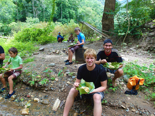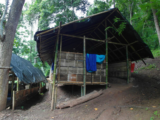 Diesmal nicht von einem Regentropfen, sondern von der brütenden Hitze geweckt, stiefelte ich leicht verkatert gegen Mittag aus unserer Hütte und begab mich unter die Dusche. Die sanitären Einrichtungen möchte ich an dieser Stelle nicht ganz unerwähnt lassen. Hätte ich auf der Reise nicht schon viel Widerliches gesehen, wäre ich beim Anblick der Dusch- und Klo-Variante ganz schön geschockt gewesen. Fliesen oder Ähnliches konnte man vergebens suchen. Es erwartete einem vielmehr ein Betonblock mit undichtem Bambusdach, das ein wenig an einen deutschen Schweinestall erinnerte und vor Dreck und Stockflecken nur so strotzte. Auch die mit braunem Flusswasser versorgte Dusche war in einem miserablen Zustand und ermöglichte es einem nur mit viel Geduld sich hinreichend zu waschen. Aber wir störten uns an solchen Zuständen kaum noch. Man konnte sogar schon fast sagen, dass es für uns zur Gewohnheit wurde.