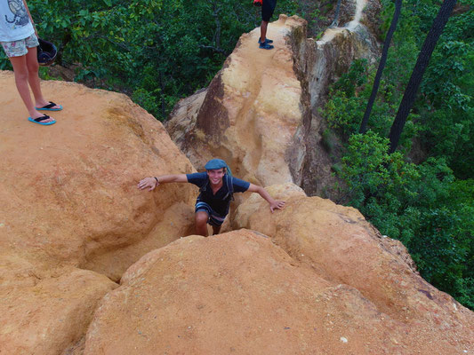 Mit getrockneten Kleidung und gefüllten Mägen traten wir unsere Nachmittagstour an. Deutlich flotter als noch am Vormittag, bretterten wir mit Maximalgeschwindigkeiten von 80km/h die asphaltierten Hügel entlang und steuerten den bereits mehrfach empfohlenen Pai Canyon an. Dort angekommen nutzen wir den weiterhin aufklarenden Himmel für eine kleine Erkundungs- und Klettertour entlang der gelben Felsstrukturen. Zwar mit dem allseits bekannten Grand Canyon nicht zu vergleichen, empfand ich den Ort allerdings als äußerst sehenswert. Wie ein gelbbraunes Band umschloss die Felsenstruktur den grünen Urwald. Wir kletterten die schmalen Grate entlang und schossen einige eindrucksvolle Fotos.