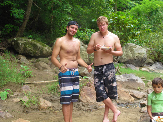 Wirklich wach wurde ich erst wieder nach mehr als 11 Stunden Schlaf am nächsten Morgen. In der Nacht merkte ich noch nicht einmal, dass mir die unzähligen Mücken mein ganzes Gesicht zerstachen. Kaum zu glauben wie anstrengend Rafting sein kann, aber man wird im Leben immer wieder aufs Neue überrascht. Im morgendlichen Nebel sammelten wir uns alle am Lagerfeuer und frühstückten zusammen. Nachdem man sein Quartier wieder aufräumte und alle seine Sachen zusammenpackte, krabbelten wir mit leichtem Muskelkater ein erneutes Mal ins Schlauchboot. Es folgte ein zweiter nasser Wildwassertag. Bedingt durch den anhaltenden Regen in der Nacht, ist erwartungsgemäß der Wasserstand des Flusses noch einmal angestiegen und ließ den Fluss noch ein wenig reißender werden. Es dauerte auch keine zehn Minuten, ehe wir uns wieder mitten im rauschenden Weiß befanden. Es wurde gepaddelt, manövriert, Gewicht verlagert und festgehalten, was unser Können hergab. Der Spaß war riesig und die Freude bei jedem Auf und Ab unvergesslich. Genau so stellte ich mir eine richtige Rafting Tour vor und genauso liebte ich es. Ich war ein weiteres Mal in meinem Element. Aber auch wirklich nichts konnte man kritisieren, es war einfach ein perfekter Abenteuertrip. Zwischendurch hielt man immer wieder an einigen prädestinierten Plätzen an und erfreute sich einiger heißen Quellen. Auch wenn die "Hot Springs" noch so interessant waren, blieb das Rafting das wahre Highlight und bereitete mir den Hauptspaß. Mitten in einer Stromschnelle kam zwar jedes Mal ein wenig Nervenkitzel aufkam, doch war es im Grunde genau das, was ich mir im Vorfeld erhoffte. Abenteuer pur. Ich konnte gar nicht nass genug werden und spornte mein ganzes Team an, sich nicht immer den einfachsten Weg durch die Rapids zu suchen. Als wir uns gegen Mittag dann aber der größten und wildesten Stromschnelle näherten, wurden wir von unserem Guide noch einmal ausführlich gebrieft. Doch trotz aller Vorsicht, drehten wir uns folgenschwer in der wilden Gischt und rutschten seitlich einen kleinen Abhang herunter. Dabei bekam unser Gefährt so starken Überhang, dass wir umkippten. Mit einem riesen Satz fielen wir...
