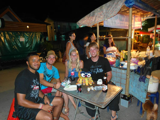 Nachdem sich der Kater etwas legte und auch Björn den Weg aus den Federn fand, genehmigte man sich zusammen mit Viola und Dan ein köstliches Frühstück auf der Terrasse eines kleinen französischen Lokals. Man ließ den Tag ruhig beginnen. Auch wenn der Tag ein weiteres Mal von Erholung geprägt war, schmiedeten wir Pläne für eine gemeinsame Scooter-Tour durch die umliegende Landschaft. Wir erkundigten uns bei den lokalen Roller-Vermietungen und liehen uns für den nächsten Tag jeder ein spritziges Gefährt inklusive Helm aus. Bevor man jedoch ins Bett ging, schlenderte man am Abend noch ein wenig die Hauptstraße mit den unzähligen bei Sonnenuntergang aufbauenden Straßenständen entlang, kauften zahlreiche thailändische Köstlichkeiten, sowie einige Souvenirs und T-Shirts. Diese gemütliche abendliche Atmosphäre mit vielen netten Menschen und gedämpften Straßenlicht zeichnete dieses Ort in einem ganz besonderen Maße aus. Keinerlei Hektik, keine Menschenmassen, kein Verkehrslärm, keine nervenden Verkäufer. Es war einfach ein Ort, der nahezu zum Verweilen einlud und dessen Charme besonders abends zur Geltung kam.